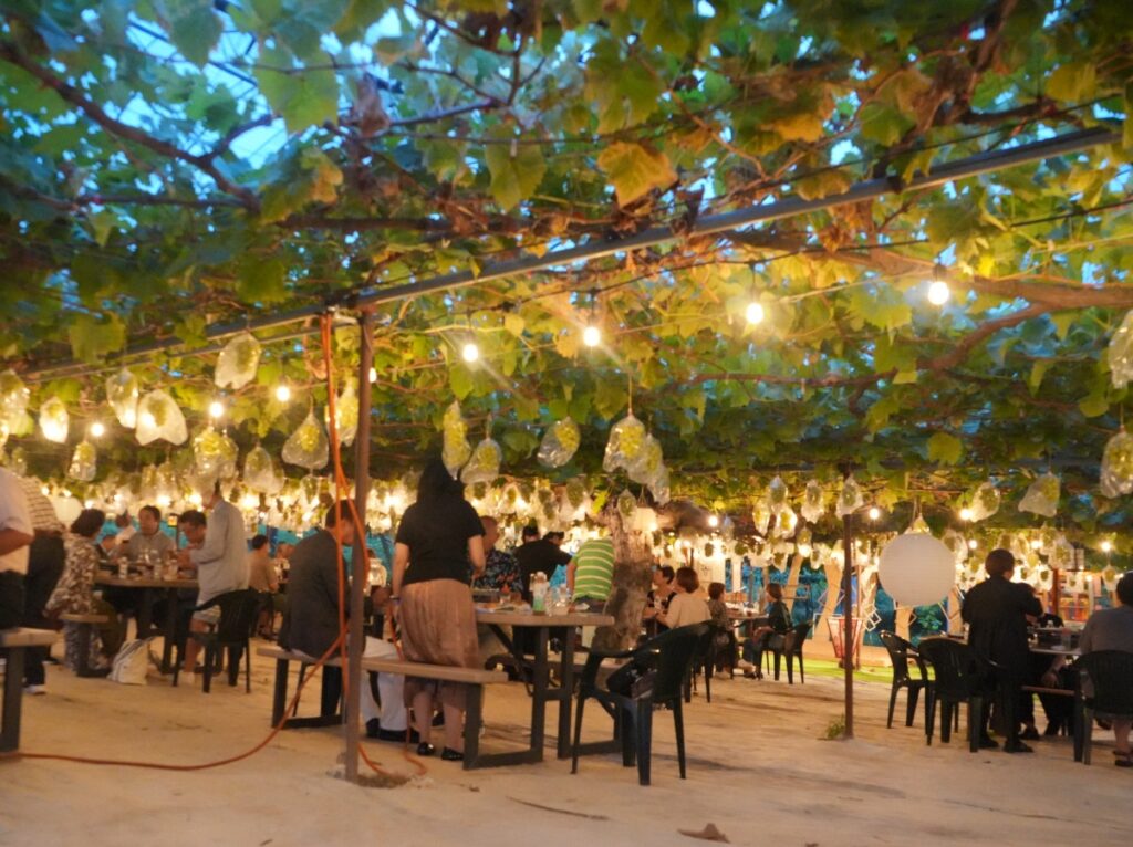 頭上にはぶどうの葉の天蓋が広がります。雨天時も安心してお過ごしいただけます。